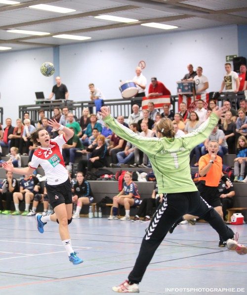 In der ersten Halbzeit konnte man den Siegeswillen förmlich spüren und der FC war sichtlich beeindruckt von der Leistung der Gegner. Fortuna trat geschlossen stark und selbstbewusst auf. Dies konnte man vom FC zu Beginn nicht sagen, da das Team um Lyn Byl sichtlich verunsichert wirkte und leichtfertige Fehler produzierte. Die Gäste konnten immer wieder in Führung gehen, jedoch schafften es die Damen des FC Köln immer wieder auszugleichen. Der ausschlaggebende Faktor, dass die Gastgeber mit Ausnahme des ersten Treffers nur einmal in Front gehen konnten (8:7, 20. Minute) stand zwischen den zwei Pfosten der Fortuna und trägt die Nummer 1 auf dem Trikot. Anna Ellereit war nicht nur ein starker Rückhalt, sondern wuchs in einigen Momenten über sich hinaus und hielt einen freien Wurf nach dem anderen. Die sonst so treffsicheren Spielerinnen des FC Kölns verzweifelten förmlich am Torwart der Südstadtkanonen und so ging die Fortuna zwar knapp, aber höchst verdient mit 11:10 in die Halbzeitpause.