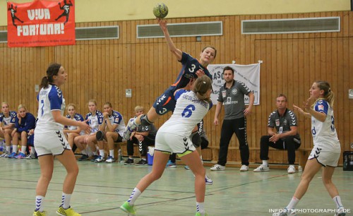 Die Partie begann ausgeglichen. Fortuna hatte in der Abwehr Probleme, doch vorne strahlte Zydre Zimmermann so viel Torgefahr aus, dass ihre drei Tore nach acht Minuten zum 3:3 reichten. Doch die Damen aus der Südstadt agierten zunehmend unorganisiert, leisteten sich schnelle Ballverluste und so konnten sich die Gäste über 3:5 auf 5:9 und 6:11 nach 21 Minuten absetzen. Zum wiederholten Male in dieser Saison befand sich Fortuna in einem Heimspiel bereits in der ersten Halbzeit deutlich in Rückstand. „Es spricht für unseren Kampfgeist, dass wir trotz schlechtem Spiel immer wieder zurückkommen, obwohl wir so deutlich hinten liegen. Aber es spricht gegen unsere Disziplin und Konzentration, dass wir uns immer wieder in diese Position bringen“, so Frontzek nach der Partie. Beim Stand von 7:13 nahm der Fortuna-Trainer bereits die zweite Auszeit und konnte sein Team endlich etwas wachrütteln. Die Abwehr und die eingewechselte Torhüterin Charlotta Quidde arbeiteten nun besser und konnten den Rückstand bis auf 10:13 verringern, ehe Dortmund den Pausentreffer zum 10:14 erzielte.