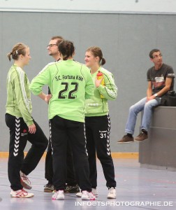 Schon in den ersten drei Spielminuten führten die ersten Ballverluste zur schnellen 3:0 Führung für Kleenheim, bevor Stefanie Wojtowicz in der vierten Spielminute das erste Tor für die SC Fortuna erzielte. Danach stärkte Anna Ellereit zwar mit zwei Paraden ihrer Mannschaft den Rücken, doch durch einfache Passfehler machte es sich die Fortuna selber zu schwer und den Kleenheimerinnen zu einfach. So stand es in der 10. Spielminute 6:2 für die Gastgeberinnen. Im weiteren Verlauf konnten die Kölnerinnen, dank einer guten Einzelaktion von Zydre Zimmermann und dem folgenden 7m, noch den Anschluss halten, doch Kleenheim blieb cool und erzielte durch einfache Kombinationen zwei Tore in Folge. Nach der ersten Auszeit von Fortunas Trainer Jannusch Frontzek antwortete die Fortuna mit deutlich mehr Druck. Julia Schumacher traf per 7m, Anna Ellereit parierte einen 7m, Andrea Bonk traf gleich zwei Mal und hielt die Kölnerinnen so mit 7:5 nach einer viertel Stunde im Spiel. Aber Kleenheim legte nach und machte es Fortuna mit einer aggressiven Deckung und schnellem Spiel nach vorne schwer, den Anschluss zu halten und nötiges Selbstbewusstsein zu tanken. Fünf Minuten vor Ende der ersten Hälfte stand es so 12:8 gegen die Fortuna Damen. Einige zweifelhafte Schiedsrichterentscheidungen, technische Fehler und Pfostenpech seitens Fortuna verhalfen Kleenheim, trotz erneuter Parade von Torhüterin Anna Ellereit, zum 14:9 Pausenstand.