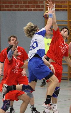 Bereits zu Beginn des Spiels zeigten die Fortunen, dass sie auch das zweite Derby der Saison für sich entscheiden wollten. Nachdem beide Außenspieler doppelt getroffen hatten, erhöhte Christian Deckarm zum zwischenzeitlichen 1:5. Grundlage dieser Führung war die von Benjamin Gülicher und Björn Kolbe bestens organisierte Abwehr, die es den SG-Angreifer schwer machte, sich gute Wurfpositionen zu erarbeiten. Erst eine Unterzahl der Fortuna brachte den MTVD auf 3:5 heran. Als die Fortuna wieder vollständig auf dem Feld stand, konnten sich die Südstädter sofort wieder auf fünf Tore absetzen, eine erneute Unterzahl führte zum 8:10. Bis hierher hielt Christian Werner, der starke Torhüter des MTVD, seine Mannschaft quasi alleine im Spiel, da der SC noch einige hundertprozentige Chancen ausließ. Kurz vor der Pause erfolgte dann ein deutliches Zeichen, wer die beiden Punkte einfahren würde. Eine doppelte Unterzahlsituation überstanden die Kölner ohne Gegentor, was in dieser Phase vor allem Manfred Hoffmann, der in der ersten Hälfte unter anderem zwei Siebenmeter abwehren konnte, zu verdanken war. Mit dem Pausenpfiff erzielte Björn Kolbe vom Punkt den 10:12-Halbzeitstand.