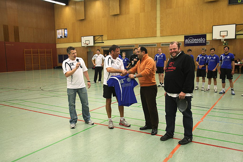 [caption id="" align="alignleft" width="420" caption="Vor Spielbeginn gab es noch Grund zur Freude: Sponsor axxessio in Person von Goodarz Mahbobi überreicht die neuen Trikots. (Foto: Stefan Sels)"][/caption]