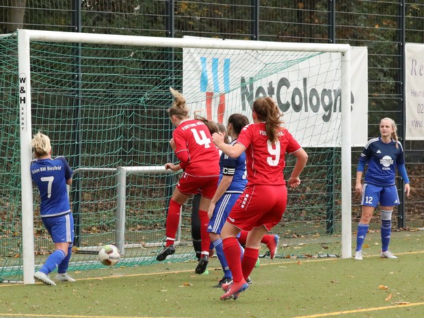 Mit den gewohnten Anlaufschwierigkeiten starteten die Frauen der Fortuna in die Partie gegen Union Biesfeld. Die Mannschaft um Garsztecki kontrollierte zwar die Partie und hatte auch einen enormen Ballbesitzanteil, doch tat man sich schwer zu klaren Möglichkeiten zu kommen. Grund dafür waren Ungenauigkeiten im Zusammenspiel und sicherlich auch die fehlende Spielgeschwindigkeit. So konnten die Gäste die gefährlichen Räume immer wieder ohne Mühe zuschieben. Die erste Riesenchance hatte dann Stein, doch ihr Kopfball aus elf Metern stellte die Gästetorfrau vor keine Herausforderung, welche jedoch mit zunehmender Spieldauer in den Spielfokus rückte. Nach 23. Minuten erlöste Catia Alves Pereira die Südstädterinnen. Nach einem tollen Zuspiel von Kira Gauger umdribbelte Alves Pereira die Torhüterin und schob ins leere Tor ein.
