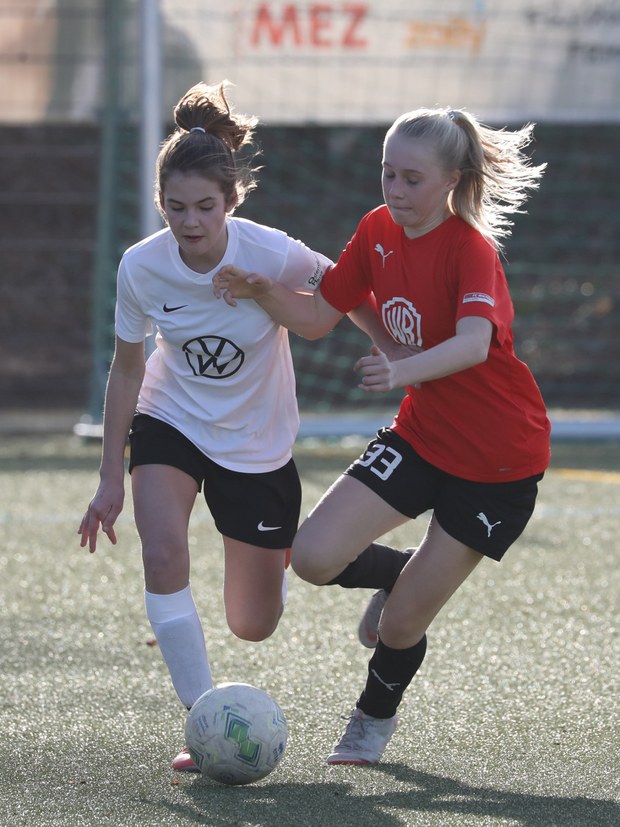 Dabei begannen die Jung-Fortunen durchaus furios. Getreu der Trainervorgabe hieß es von Beginn an, Vorwärtsgang einlegen und das Spiel in die gegnerische Hälfte verlagern. Bereits nach zwei Minuten das erste Tor durch Lea für die Südstädterinnen. Kurz danach eine weitere Riesenmöglichkeit, den Vorsprung auszubauen. Lia verfehlt mit einem fulminanten Schuss nur um Haaresbreite den Winkel des Rheinsüd-Gehäuses.
