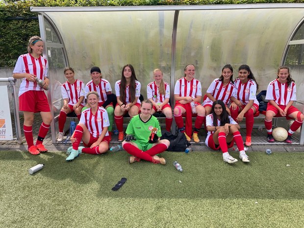 Sonntags ging es dann in die Landeshauptstadt zum CfR. Diese spielen Niederrheinliga und sind damit eine Klasse höher angesiedelt als die Fortuna-Mädchen, deren Aufstiegsmöglichkeit leider der Pandemie zum Opfer gefallen war. Die Kölnerinnen reisten mit dem letzten Aufgebot an, fast der komplette Angriff fiel an diesem schönen Sommertag aus. Doch die Karten waren von Beginn an klar verteilt. Fortuna im Angriffsmodus erspielte sich Chance um Chance und musste doch bis fast zur 20. Minute warten, ehe das hochverdiente 1:0 durch Najada fiel. Die Fortuna agierte nun noch offensiver und erzielte durch Najada (27.) und Lena (34.) die 3:0 Halbzeitführung. Trotz souveränem Spielverlauf war der Trainer trotzdem nicht wirklich zufrieden. Zu kompliziert war das Angriffsspiel, zu viele Stockfehler unterbanden die eigenen Angriffe. Torhüterin Elena hatte nichts zu tun und so wurde, da Linksverteidigerin Rhea Schmerzen hatte, kurzerhand getauscht. Rheas Debut zwischen zwei Pfosten.