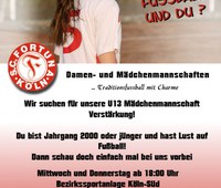 Die Nachwuchsabteilung des S.C. Fortuna Köln e.V. sucht für die kommende Saison noch Übungsleiter / -innen für die U13 Juniorinnen. Sollten Sie Spaß am Fußball und Freude am Umgang mit Mädchen haben, so freuen wir uns über Ihre Bewerbung via E-Mail an juniorinnenkoordinator@fortuna-koeln.de. Erfahrungen als Jugendtrainer sind natürlich vorteilhaft, stellen aber keine zwingende Vorrausetzung dar.
