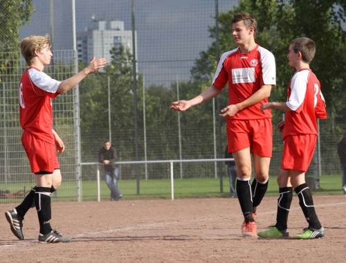 Dabei gelang unserem Nachwuchs im Schatten der Regionalligapartie von Bayer 04 im Südstadion und mit musikalischer Untermalung des nahen Kölner Oktoberfestes ein Traumstart. Schon nach vier Minuten verwandelte Fabian Knorr einen Freistoß aus rund 18 Metern absolut sehenswert im gegnerischen Gehäuse. Doch statt das mögliche zweite Tor nachzulegen, scheiterte Fortuna zunächst an der Chancenauswertung und wenig später dann auch an dem Herausspielen von Torchancen. Die Gäste blieben insgesamt viel zu harmlos und kamen nur selten zum Torabschluss.