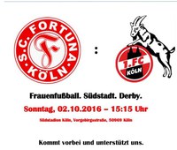 Am 2.Oktober um 15:15 Uhr bittet die 1.Frauenmannschaft des S.C. Fortuna Kölns die Zweitvertretung des Stadtrivalen vom 1.FC Köln zum Derby in die Kölner Südstadt! An diesem Tag erwartet die Zuschauer traditionell ein Spiel auf hohem Niveau, dass neben viel Tempo vor allem eines bietet: Einsatz mit Leidenschaft! Kommt vorbei und unterstützt die 1.Frauenmannschaft vom S.C. Fortuna Köln! 6.Spieltag...