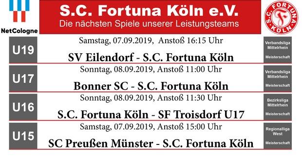 Auch unsere U17 startet am Sonntag, Anstoß 11:00 Uhr, mit einem Auswärtsspiel beim hoch gehandelten Team des Bonner SC in die Saison der Verbandsliga Mittelrhein! Ebenfalls am Sonntag empfängt unser jüngerer B-Junioren Jahrgang die U17 der SF Troisdorf in der Bezirksliga Mittelrhein. Anstoß ist um 15:00 Uhr auf dem Kunstrasenplatz im Jean-Löring-Sportpark.