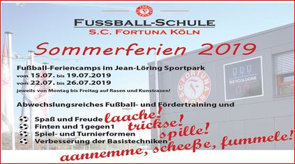 Die Fußball-Schule des S.C. Fortuna Köln e.V. startet in den ersten beiden Wochen der Sommerferien 2019 mit zwei Fußball-Camps im Jean-Löring-Sportpark in der Kölner Südstadt!