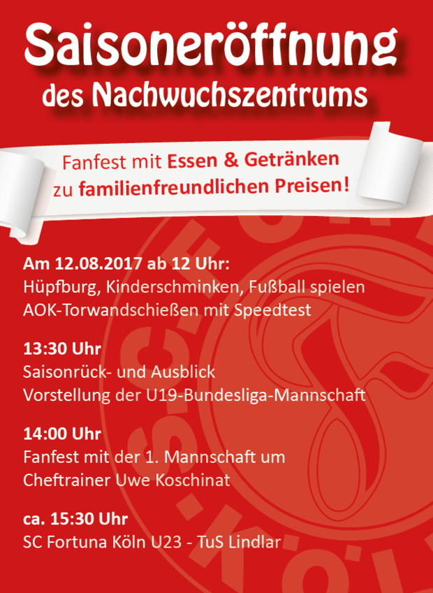 Als besonderes Highlight wird am Samstag zudem erstmals das neue Vereinszentrum (eingeschränkt) nutzbar sein. Ein famoser Saisonstart der 1. Mannschaft, der fast fertige Neubau der Geschäftsstelle und der anstehende Auftakt unserer U19-Bundesligamannschaft gegen Münster sollten also genug Grund zum Feiern sein. In dem Sinne: Der SC Fortuna Köln e.V. freut sich auf Ihren Besuch!
