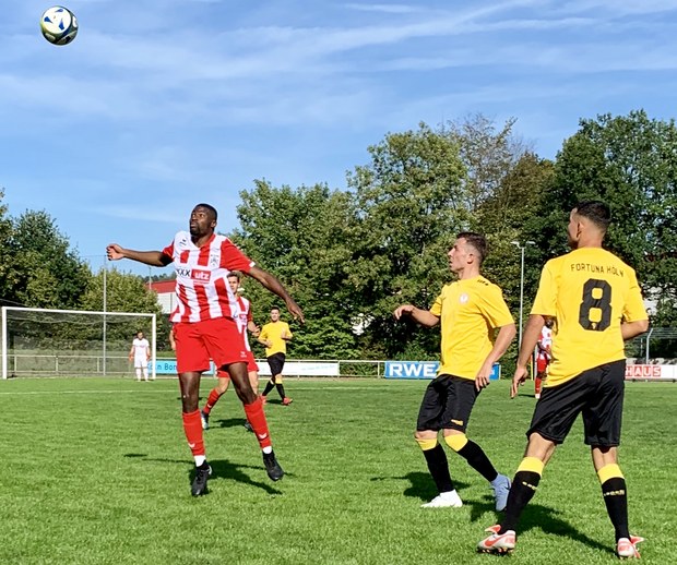 Ibis Renda und Sahan Özen beobachten den Hennefer Matona-Glody Ngyombo beim Kopfball.