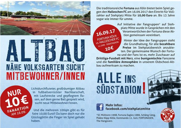 Beim Heimspiel von Fortuna Köln gegen den Halleschen FC am Samstag, den 16.09.2017 wartet auf alle Besucher des Südstadions ein ganz besonderes Angebot: ein reduzierter Eintrittspreis von 10 € für Vollzahler auf Stehplatz Mitte.