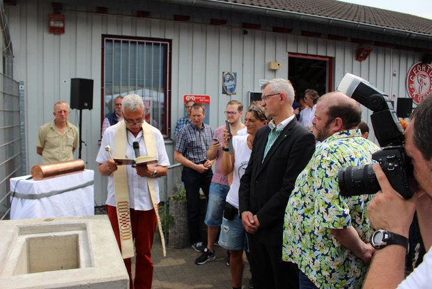 Nachdem auch Bezirksbürgermeister Andreas Hupke die Bedeutung des neuen Vereinszentrums und seine Verbundenheit zur Fortuna skizzierte, segnete Pfarrer Müller den Grundstein.