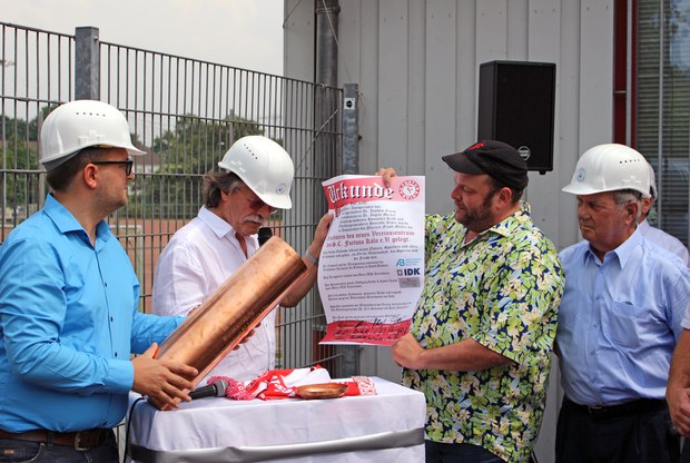Vor rund 100 Gästen fand am Freitag die offizielle Grundsteinlegung zum neuen Vereinszentrum des SC Fortuna im Jean-Löring Sportpark statt.
