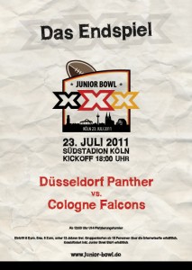 http://verein.fortuna-koeln.de/2011/07/football-im-sudstadion/colognefalcons/Während der fußballlosen Zeit gastiert am 23.07.2011 der Football im Kölner Südstadion. Die Cologne Falcons Juniors treffen dort im Endspiel um die Deutsche Meisterschaft im Jugend-Football, den Junior Bowl, auf die Düsseldorf Panther. Kickoff ist nach dem Spiel der C-Jugend (ab 15 Uhr) um 18 Uhr.