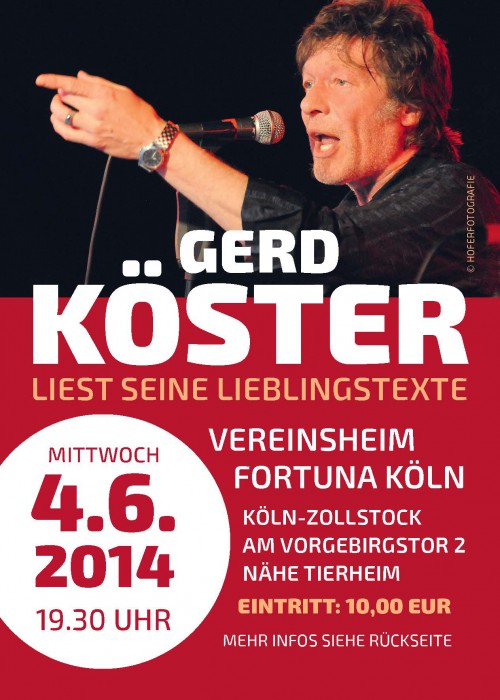 Veranstaltungstipp für Anfang Juni: Am 04.06.2014 liest Gerd Köster ab 19:30 Uhr in unserem Vereinsheim seine Lieblingstexte. Die Tickets kosten 10,00 Euro.